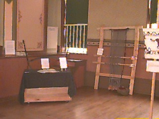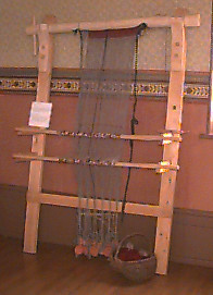 | This warp-weighted loom is a composite piece based on looms in the Nationalmuseet, Copenhagen and the Norsk Folkemuseum, Bygdoy. This style of loom was common throughout Northern Europe at the time of the Conquest and remained in use in parts of Scandinavia until the last century. The work in progress is a 2/1 twill - a weaving pattern that creates an obvious diagonal effect on the cloth. This particular twill is well-suited to the warp-weighted loom and creates a 2-sided fabric. The "weft face" at the front principally shows home-dyed handspun wool. The "warp face" at the back shows the machine-spun gray weft fibres. (Loom constructed by David Cox.) |