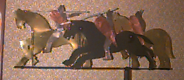 original. "Scramseax" 'pattern welded' steel, antler (from the collection of Anita Kilgour) The Saxons derived their name from their word for knife - "seax", pronounced 'SAX'. They favoured a distinctive blade shape, with a long straight edge, slight widening towards the tip, and diagonal line to the point. 'Scrameax' means literally 'short knife', and small tool knives like this one where commonly worn by almost everyone. The blade is made using the pattern welding technique, a method perfected by the Saxons and widely used by the Vikings. In this blade, there are over 1000 individual layers of different steels forming the material of the blade. "Great Hall Andiron" forged steel The form of this large log holder was taken from an Early Medieval artifact from England (seen on a TV documentary!). The Normans were largely responsible for introducing the building of stone 'keeps' into England. A huge number sprang up immediately after the Conquest as they took control of their new holdings. They would hardly have been comfortable accommendations, the large spaces defined by the stone walls heated only by open fires in the middle of the floor. Large andirons like this one would have served to support the logs as they burned. As a a further reflection of the theme, the main bar is worked in punch work showing mounted Normans on one side and Saxon foot soldiers on the other. |