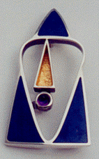 | In this brooch I have reduced one of the warders (pawns) to its most basic existence as an arrangement of triangles, creating both a modern abstract design and a very clear, simple representation of a Norse warrior with his sword and shield. |