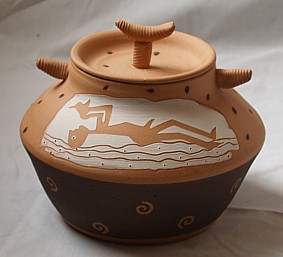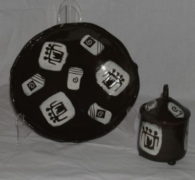 voyage. Food was considered essential in life as well as death so this bowl is for the sharing of food. Our funeral practices also centre around food and companionship. The keepers of the earth image was inspired by a Haitian painting and used because I like the idea of sharing, community and protection that I felt it inspired. We come from, live on and return to the earth. It is our responsibility to conserve and maintain it. The Memory Jar has feet and a sculptural knob to give it presence. The title Memory Jar allows it to contain other mementoes (dried flowers, small notes, keepsakes) as well as ashes
