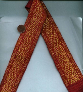 II of Sicily mantle reconstruction" Throughout history, the items placed with the body in a tomb are used to identify the status and wealth held by the person in life. The gold and red silk band formed a portion of mantle worn by King Roger II of Sicily when he was entombed. Silk thread had to travel a great distance to reach Palermo where the original band was constructed in 1133, so with the addition of the gold brocade threads it demonstrates that King Roger was held in high value by those he left behind.