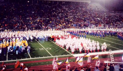 Finally, for a nice change of pace, here's a picture of band day at Memorial Stadium. The KU band is in the middle and they're surrounded by 2,400 high school band members. The hole near the 20 yard line is probably where the Eureka band was supposed to be; their bus wrecked on the way to Lawrence. Surprisingly our football team didn't wreck and won the game against the Southern Illinois Salukis (?) 42-0. |