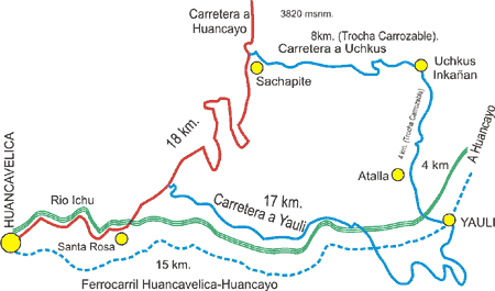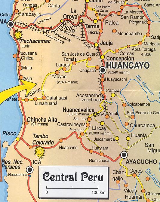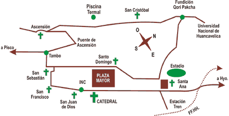| PLAN DE RUTA: Lima - Huancayo en bus. Huancayo - Huancavelica en el Tren Macho. Huancavelica - Paracas en bici Paracas - Lima en bus. ITINERARIO 31/12/2006 Lima - Huancayo (3,261 m.s.n.m.). En bus. Aquí nos quedamos para aclimatación y pasar el Año Nuevo 1/1/2007 Descanso en Huancayo. Aquí pasamos la segunda noche para aclimatación. 2/1/2007 Viaje en el Tren Macho de Huancayo a Huancavelica (3,680 m.s.n.m.) 3/1/2007 2do día en Huancavelica. Circuito Monumental en bici: Plaza Mayor, Iglesia de la Catedral, Museo Daniel Hernández, Iglesia de San Juan de Dios, Iglesia de San Francisco, Iglesia de San Sebastián, El Tambo de Mora, Puente de la Ascensión, Iglesia de la Ascensión, Piscina de Aguas Termales del barrio de San Cristóbal, Iglesia del barrio de San Cristóbal, Puente de Piedra, Mirador de Guzmán Poma de Ayala, Horno de fundición colonial Ccoripaccha, Estadio Deportivo del Barrio de Santa Ana, Iglesia del barrio de Santa Ana, Estación Ferrocarril Huancayo-Huancavelica, Iglesia de Santo Domingo. |