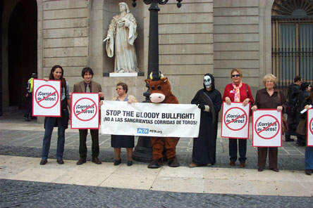 En la foto (a la izquierda) Diana junto a Jordi Portabella del partido político de ERC (Esquerra Republicana de Cataluña) quien se unió a los activistas apoyando la concentración antitaurina delante del ayuntamiento de Barcelona, convocada por PETA el día 13 de noviembre del 2003. |