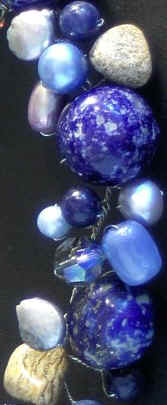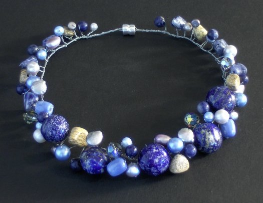 15-16" choker of individual wrapped, floating lapis, sodalite nuggets, blue ceramic, beige picture perfect jasper, freshwater blue & gray pearls and swarovski crystal style: FN21BEL