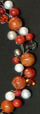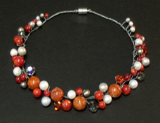 15-16 inch choker of individual wrapped, red coral, white marble, freshwater white & gray pearls and swarovski crystal, with magnetic catch style:FN19R