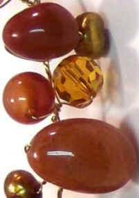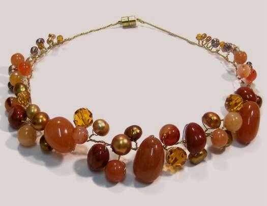 16-17 inch choker of individually wrapped carnelian, jasper, orange aventurine, freshwater pearls and swarskovi crystals with magnetic catch
