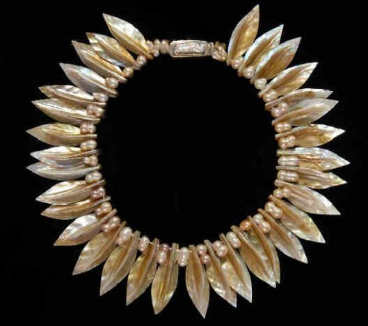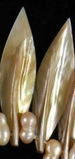 16 inch strand of carefully carved mother-of-pearl leaves, interspersed with matched double freshwater pearls style: PLEAF $136.00