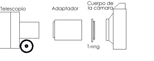 Fotografía con telescopio.- aquí encontramos también dos variantes, a foco primario y en proyección variable, la primera forma usa el telescopio como lente de nuestra cámara y en la segunda usaremos además nuestros oculares para amplificar la imagen obtenida, para cualquiera de ambos métodos necesitaremos como parte de nuestro equipo un adaptador para “conectar” nuestra cámara al telescopio, en el mercado existen varios modelos y precios a escoger, funcionando casi todos de igual forma.