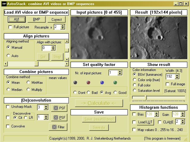 Una vez capturadas las imagenes o el video, puedes procesarlas con Astrostack de R.J. Stekelenburg Netherlands (freeware), otro excelente programa que permite sobreponer o encimar (stack) varias imagenes (BMP) ó encimar en una sola imagen todos los cuadros obtenidos en un video (AVI), utilizando diferentes métodos de combinación, alineación y máscaras (deconvolution)