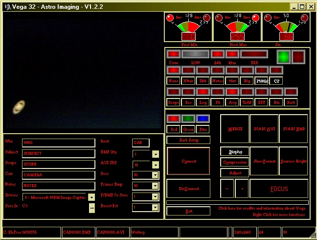 Puede utilizar el software proporcionado con la webcam o utilizar un excelente programa llamado Vega Astro Imaging credo por Colin F. Bownes, el cual lo puedes obtener de manera gratuita (freeware) en la WWW, este programa te permite obtener un video de hasta 60 segundos y de 1 a 30 FPS (cuadros por segundo) o de 1 a 99 ó 1000 imagenes en formato BMP.