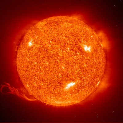 Inmensa bola de hidrógeno cuyos átomos se fusionan en su interior produciendo helio por la presión de sus capas exteriores. Gracias a él, desde hace 5 billones de años, nuestro planeta se satisface de luz y calor permitiendole la vida. Su enorme gravedad mantiene en orbita a los planetas.