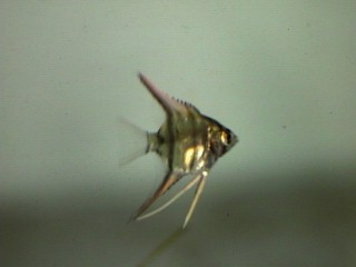 After hatching, the babies drop to the floor of the tank for several days. After 5 days, they have consumed their egg yolk, become free swimming, and are now ready to eat. I put paramecium into the tank 5 times per day for one week, then feed them newly hatched brine shrimpand microworms. A partial change of water is done each day for another 3 weeks. By this time they are eating dried foods. |