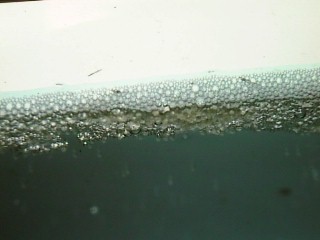 The Siamese Fighting Fish is able to take oxygen directly from the air through his labyrinth, so they can live comfortably in small jars. To breed them. I place a male in a small aquarium (30cm by 15cm by15cm). At 27.5 degrees Celcius, he will soon build a bubble nest by coating bubbles of air with mucous and spitting them together on the surface. The nest is often 10cm in diameter. |