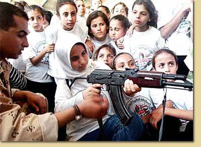 Palestinian Authority TV broadcasts constant images of children carrying weapons and staging mock attacks on Israelis. Over the summer, children as young as 12 were trained in the use of Kalshnikov rifles and other weapons at special camps by Fatah officials.