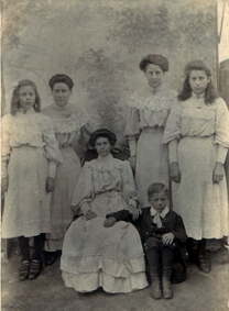 Taken about 1908 I guess. From left to right : Elizabeth HODGES (born 9th March 1894 Sellindge, Hythe, Kent, died 30th Oct 1989(aged 95)), Ruth HODGES (Born Jan/Mar 1883. Died aged 34 in 1917 lived Sittingbourne), Rachel HODGES, (Born 8th February 1890. Died aged 86 in 1976.), Kate HODGES (Born 11th March 1892. Died 17th August 1989 (aged 97), sitting down Marion HODGES (Born Apr/June 1887.died 3rd October 1906, aged 19) and James HODGES(Born June 1899. Died aged 80 1979). Marion HODGES had a damaged leg, which is why she is sitting, she later died of tuberclerosis. |