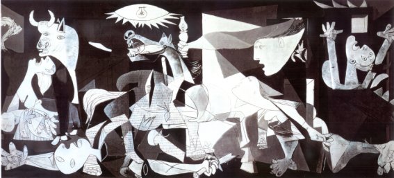 ![]() GUERNICA ! Este famoso quadro foi encomendado pelo governo republicano espanhol a Picasso, em 1936, para expor em Paris. O quadro chamava-se "Lamento en muerte del torero Joselito", e era uma homenagem de Picasso ao seu amigo Joselito, morto na arena. Onde os "especialistas" vêm cenas de bombardeamento na realidade só existe o touro que o matou, o cavalo do "picador", sol-e-sombra e o corpo do toureiro. Picasso recebeu pela "obra", 300.000 pesetas (de 1936) . Observando o quadro, podem distinguir-se touros e cavalos, num paroxismo de drama e morte. O que não se consegue descortinar são aviões, casas, guerra ou bombardeamentos. |