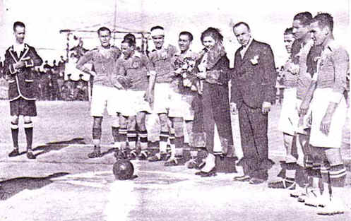 Fotografía tomada en el partido de ida de la Copa de España de Aficionados ante el R. S. Aranjuez, en el que hizo el saque de honor la Miss España, Emelina Carreño, natural de Alcázar de San Juan. Ganó el Aranjuez por 1-2. De izquierda a derecha: el árbitro, Angel Pacheco, López, Goyo, Morales, Srta. Emelina Carreño (Miss España), Joaquín Hernández (presidente), Ortiz, Monroy y Mora.