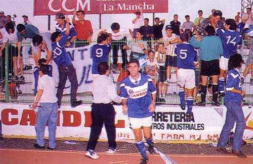 Final del partido. El Manchego ha vencido por 2-0, y ello unido a la victoria del Moralo ante el Motril, hace que el Manchego retorne a Segunda B. Los jugadores corren a celebrarlo con los aficionados.