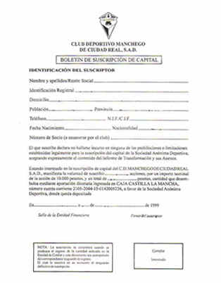 Boletín de suscripción de capital para la conversión del club en S. A. en el año 1999. |