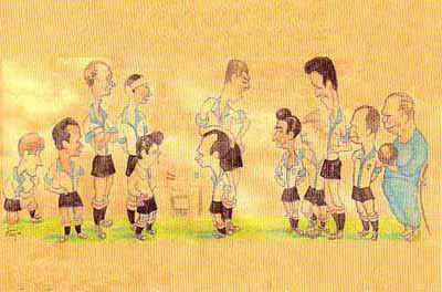 Caricatura del equipo de la temporada 1949-50, obra de Julián Pérez Muñoz. De izquierda a derecha: Rodríguez, Adolfo, Solana, López, Galiana, Jovito, Las Heras, Carbonell, Nino, Gallego, Valch y el entrenador Maside con el látigo.