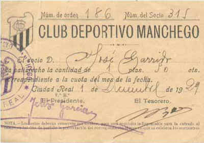 Recibo de socio de 1929. Destaca el primitivo escudo del Deportivo Manchego (1929-1933), diseño del dibujante Domingo Mozo, directivo del club.