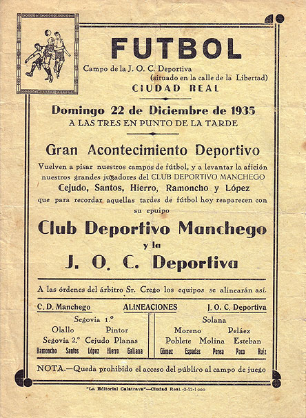 Publicidad de un partido de fútbol entre el Club Deportivo Manchego y la J. O. C. Deportiva, en el año 1935.