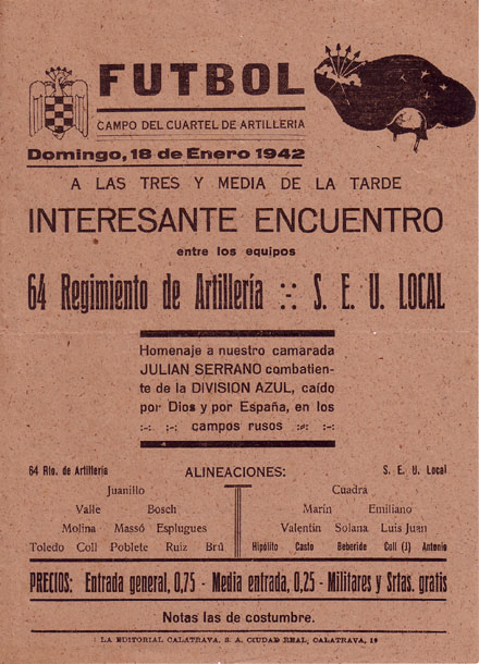 Publicidad de un encuentro entre los equipos del 64 Regimiento de Artillería y el S.E.U. Local. En la alineación de ambos figuran gran parte de los jugadores que al año siguiente conformarían el futuro Club Deportivo Manchego.