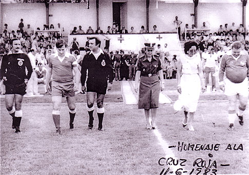 Partido homenaje a la Cruz Roja. De izquierda a derecha: Juan Cañestro, Morales, Fermín Sánchez Molina y Ferenc Puskas.