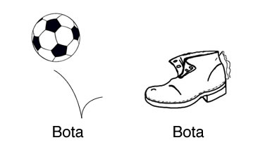 | Hay que recordar que los homógrafos tienen distintas etimologías pero la misma pronunciación y se escriben igual. 1. bota (del latín tardío buttis, odre) Cuero pequeño empegado por su parte interior y cosido por sus bordes, que remata en un cuello con brocal de cuerno, madera u otro material, destinado especialmente a contener vino. 2. bota (del francés botte) Calzado, generalmente de cuero, que resguarda el pie y parte de la pierna. 3. boto, bota (del gótico bauths, obtuso) adj. romo |