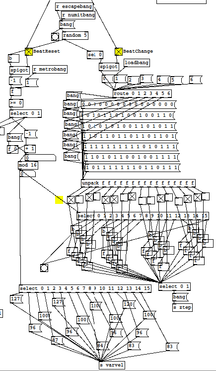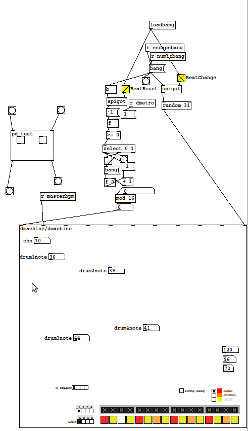 2. turn on the metro banger the left one goes to the 4 notemakers the one on the right goes to the drum sequencer