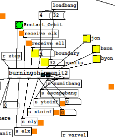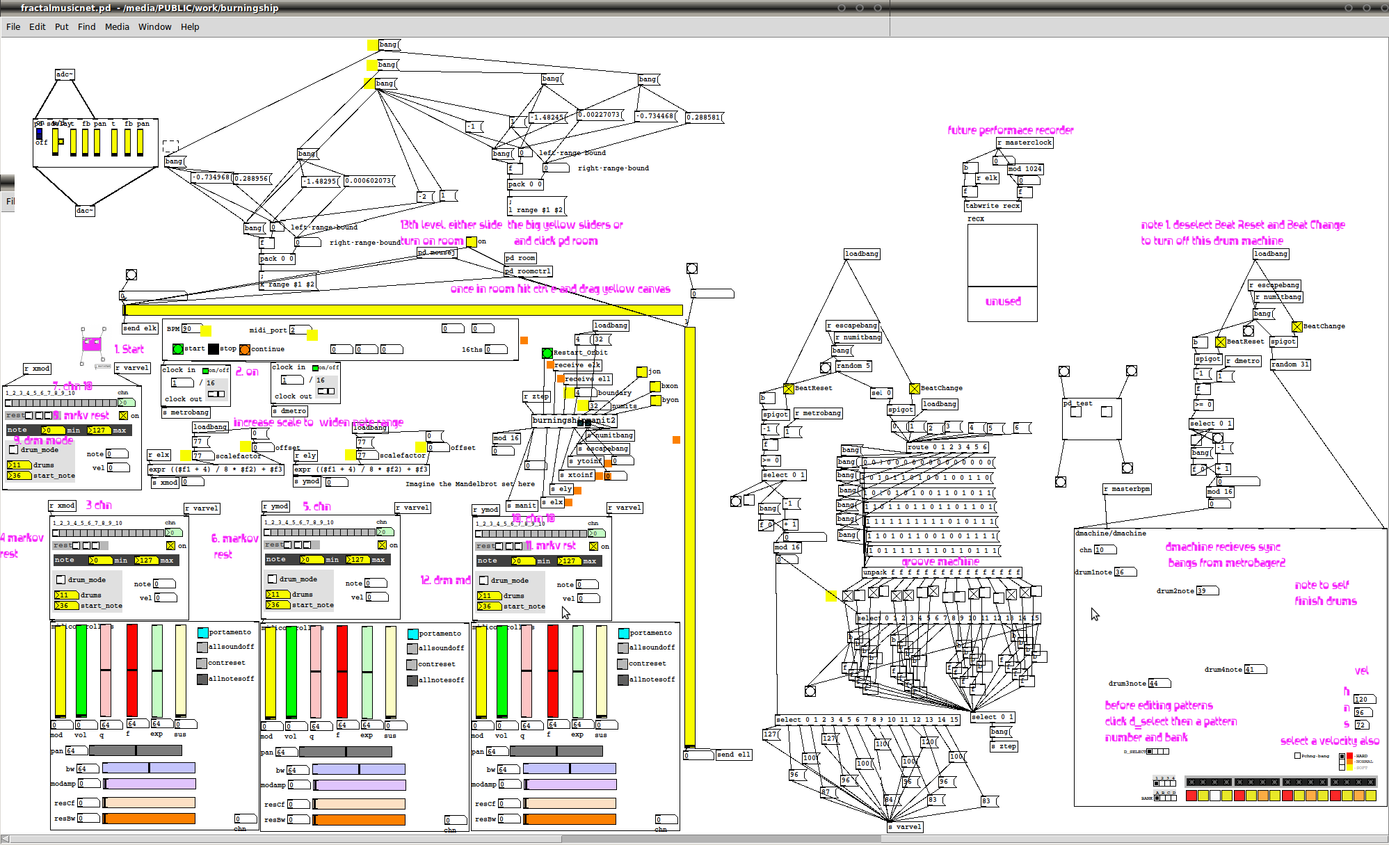 I uploaded my fractal music maker patch if u get the time to try it out, it just outputs midi, the bpm control is global and works for syncing if u want to chain from a recorder, i use the 2 outers as drums and u dont get no sound till u hit start and select channels and toggle the rests - all 3 equals no rest(markov) if u turn on the room and go in(pd room) hit ctrl e to drag c around or whatever edit mode is on your machine.. http://www.geocities.ws/billy_stiltner/ … ngship.zip oh yeah the most recent is fractalmusic.pd except i have one that works with udp and a javascript fractal i'm still working on zooming and switching fractals. julia is not julia yet but bshipx and bshipy are.
