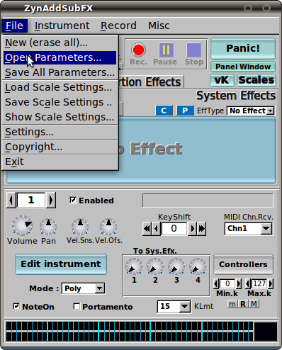 Open a parameters settings file in ZynAddSubFx. A good one to try is from myzynpatches/settings3.xmz