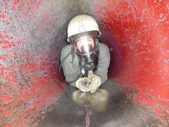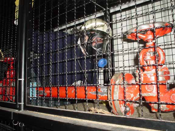 Exercise for working with the BA sets. The "cage" consists of connected cubes of 90x90x90 cm with all kinds of doors, hatches, valves, narrow spaces, etc. and is about 15m long. It is pitch dark with artificial smoke, noise and temperatures up to 120°. The idea is to simulate the situation you find when fighting a fire in the engine room, cargo spaces or elsewhere inside a ship.