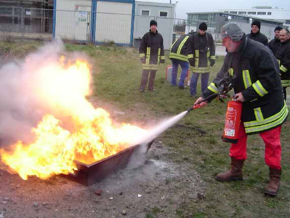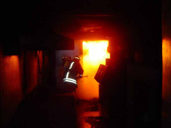 Fighting a real fire in the "burning container" with the hose pipe in full fire fighting clothing and breathing through the BA set.