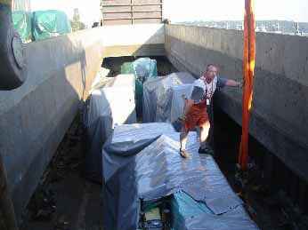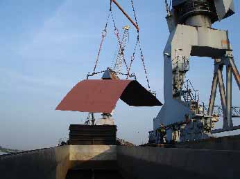 The M/S "Brake" is a coaster. She operates mainly in the Baltic and North Sea but eventually makes voyages as far as to the Mediterranian or to Iceland. She is only 59 m long and has a cargo capacity of 730 metric tons. Her cargo is everything not containerized - although if necessary she could also load 12 standard containers. Most of her cargoes are bulk cargoes such as grain or fertilizers or animal food. Another standard cargo is steel plates. She sometimes takes project cargo such as the engines seen in the photo above or any kind of general cargo, such as boxes, bags, packs, coils of everything.