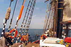 - Schade war, dass viele Segel kaputt waren und daher das Schiff etwas unvollstaendig aussah. Wir haben waehrend der Reise den Flieger und den Aussenkluever geflickt. Die beiden Untermarsen waren nicht angeschlagen, weil sie kaputt waren und die Stengestagsegel fehlten auch. Und das Grosssegel felte auch. Wir haben das Besansegel dafuer an den Grossmast angeschlagen, was aber aber das Wenden vor allem verhindert. So mussten wir Halsen fahren. Das Besantoppsegel war zwar in Ordnung, wurde aber aus Schoenheitsgruenden nicht gesetzt, weil das Besansegel fehlte (oder veilleicht doch, weil es das komplizierteste Segel ist???)