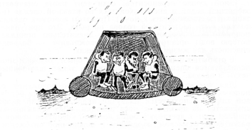 If you see somebody swimming in the water from your life raft, throw a rope with a handle towards him and tow him to the raft.
