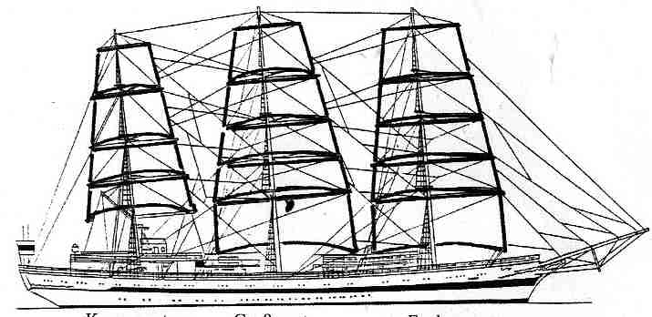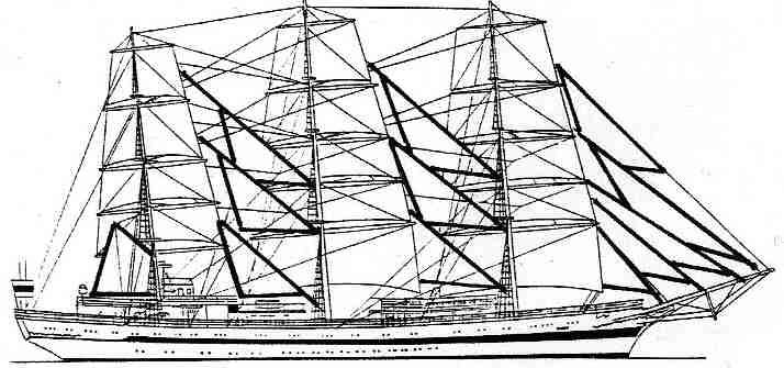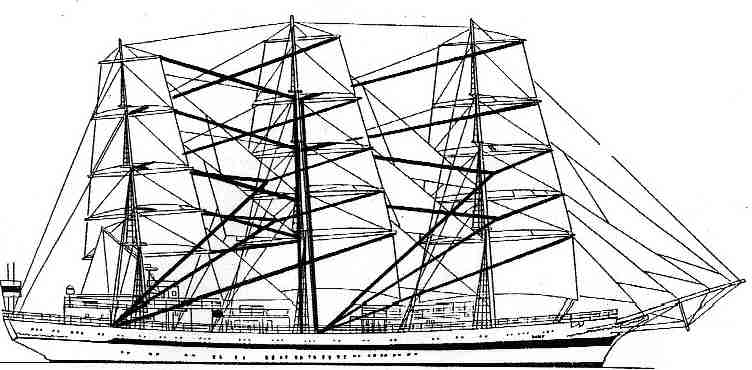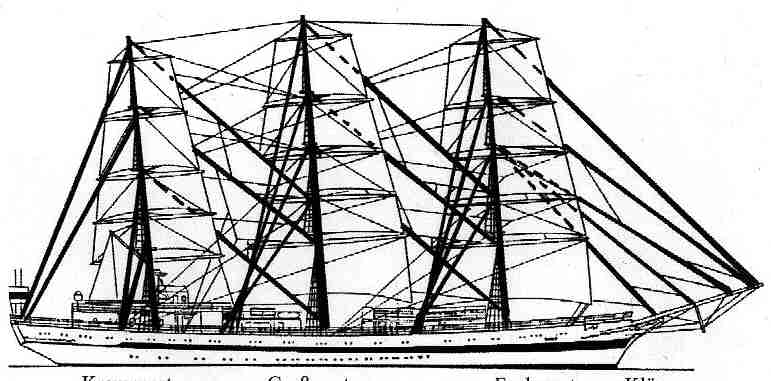 | mizzen mast | main mast (mizzen braces led crosswise and fore braces) | |