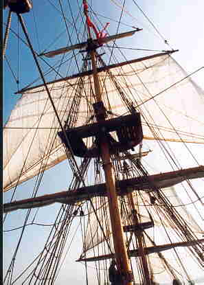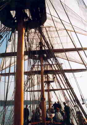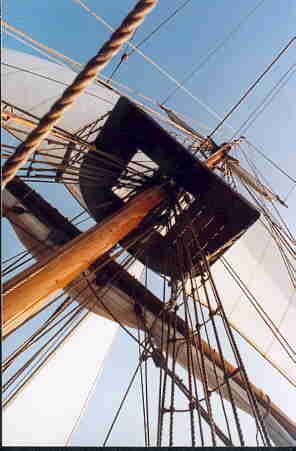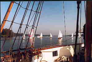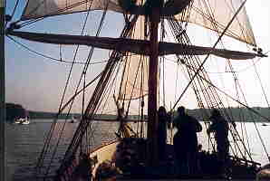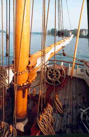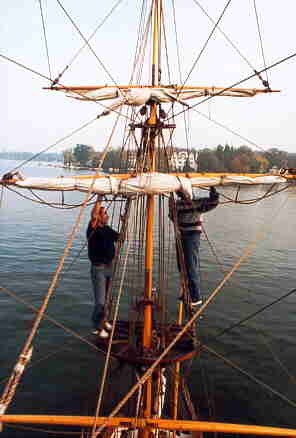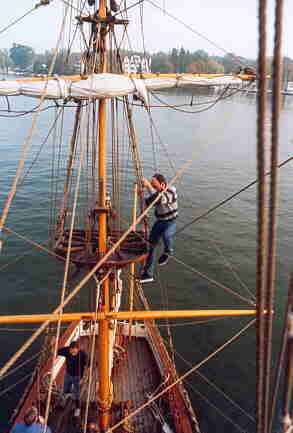 Auf dem Heimweg dann der wundersch�ne Ausblick aus dem Rigg auf die heimatlichen Naherholungsgebiete. Das Strandbad Gr�nau von oben. Aber auch der Kampf mit dem ebenfalls nur 1/3 gro�en Rigg, mit engen Wanten und historischen Gegebenheiten. Das Binden der Zeisings mit einer Hand, die eigenverantwortliche Arbeit und eigene Entscheidung, was zu tun ist. Gew�rzt mit der Tatsache, dass ohne Takelgurt oder sonstige Sicherheitsvorkehrungen oben hantiert wird. Halt so, wie es in den B�chern �ber K�pt'n Hornblower beschrieben ist.