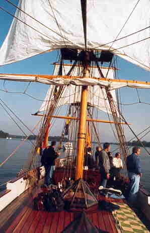 Ich fand mich also zum verabredeten Zeitpunkt am Liegeplatz ein und durfte erst einmal Deck schrubben und mithelfen, das Schiff f�r die Tagesg�ste auf Hochglanz zu bringen. Dann wurden alle Segel ausgesch�ttelt um das reichlich in ihnen vorhandene Regenwasser zu entfernen und danach in ihrem Geschirr h�ngen gelassen. Nach letzten Aufr�umarbeiten und einem weiteren Deckwischen kamen dann auch die Tagesg�ste - diesmal Angeh�rige der Firma BTG-Berlin (Eigner) - und es ging los. Auch wenn kein Wind war, so setzten wir doch die Marssegel und den Kl�ver. Da wir aber zu einem bestimmten Zeitpunkt in Berlin-Rauchfangswerder erwartet wurden, musste nat�rlich der Diesel dazukommen. Das Ergebnis waren vom Fahrtwind backgeschlagene Segel... Auch der Versuch sp�ter, bei etwas aufbrisenden L�ften noch die Bramsegel dazu zu setzen brachte nur etwa 0,2 kn Fahrt. Die strahlende Sonne, die das oktoberlich goldene Laub des umgebenden Waldes erstrahlen lie�, vers�hnte uns aber damit. So lie�en wir an Ziel angekommen den Anker fallen und ergaben uns dem Dolce Vita.