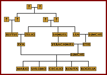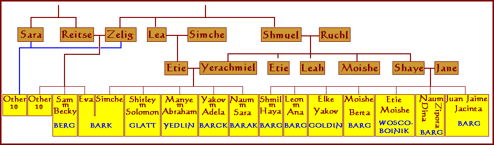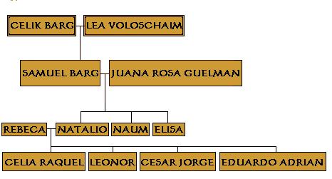 For the solution of the last part of the puzzle I owe my gratitude to Mario Jeifetz and the colossal work he did by gathering the information on Jewish settlers in the colonies of the Province of Entre Rios, Argentina. On that morning in 1972, when we asked Grandma Eva why had Greatgranfather Yerachmiel choose to emigrate to Argentina, she replied that having had family in Moisesville this was the natural thing to do. I thought then that she meant Shaye Barg but then realized that Shaye Barg's emigration in 1905 with the Kherson group was directly to Monigotes and all the other Barg Families had settled in other Provinces (Parana) and cities (Buenos Aires). For years I looked in the list of families and settlers of Moisesville and couldn't find any Barg, Berg, Bark or similar spelling names. Then Mario's site was online and it contained the complete list of names of passengers of the Wesser,the first settlers of Moisesville. This list, not like many others that stated the name of the Head of the family and number of members of the family, was complete and in some instances stated the previous nee) surname of the wife. And then and there, next to the name David Rosenthal was that of his wife Ana Jane BARK. At last the connection did make sense and after 35 years in the search I managed on February 2007 to complete the Genealogical tree of the Barg Family I am proud to present here to you: |