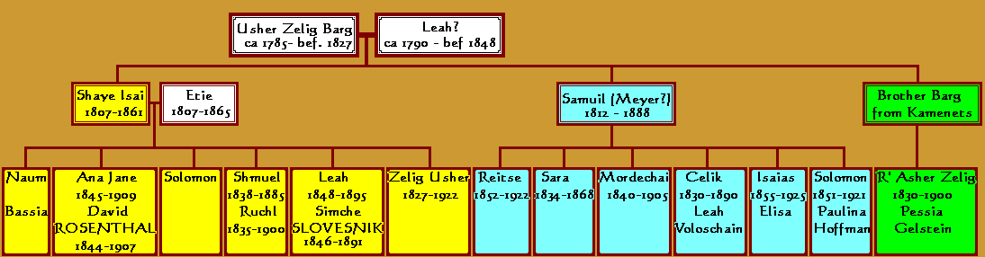 | Very early in my search I began getting information on Barg and Berg families in Podolia. A fellow amateur genealogist, Howard SedlitzBerg family from Kamenets Podolski. He mentioned other connections he had made including the family of Prof. Alex Barg, a world famous mathematician and made me realized there were many out there that didn't fit the saying by Bobe Eva that "all the Bargs in the World are related". For example Yankl Barg, born around 1880 and married to Feige who were killed by the Nazis in 1942 together with their children, Yenta and Yoselle while their son Chaim, a fighter pilot in the Soviet Air Force and a recipient of a posthumous Medal for Bravery, was killed in action during the 1942 counter attack in Stalingrad (I managed to contact descendants of their eldest son, David, through their daughter Gladys Barg Blank). There was a Barg family from Mogilev Podolski represented by David Barg. But the most interesting data was that related to a Rabbi Asher Zelig Barg from Kamenets who had descendants in the USA through his daughter Esther. At the same time I was trying to correspond with all the Bargs in Argentina and found that many of them were descended from an homonimous Rabbi Asher Zelig Barg from Kamenets through a son named Sinai Ber Boris Barg. Sinai Barg was a very interesting name since it both made sense in the "Mount Sinai" sense (Barg=Mountain) and also a similar name was given by Great Uncle Samuel Berg upon his arrival to Ellis Island as next of kin in the USA (a sister named Sinaida Staw, living in 528, 11 St. New York, probably a stepsister-cousin from Zelig's first marriage). The year of birth of Sinai Dov (1865) and Esther (1870 or 1872) made them belong to the same generation. This meant that their fathers were either namesakes, Rabbis and living in Kamenets Podolski or the same person. I discuss the subject with several amateur genealogists and we all came to the conclussion that two Rabbis named Asher Zelig Barg would try to differentiate themselves from the homonimous person by "adopting" a "Kinnui" (alias) like Asher Zelig the tall, the wise, the Redhaired, etc.. Therefore it made sense that both Rabbis were actually the same person. Taking a 25-30 year gap between generations this Rabbi Asher Zelig Barg from Kamenets Podolski would have been born around 1830 and died before 1904, the year in which a grandson was born, Elias Zelig Barg, bearing his name introduced me to his |