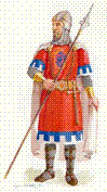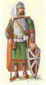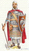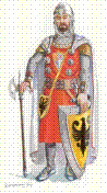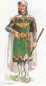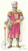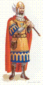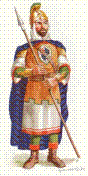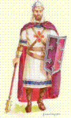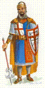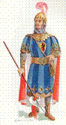 de azul. Capa roja. Cota de mallas y casco dorado con pluma roja.