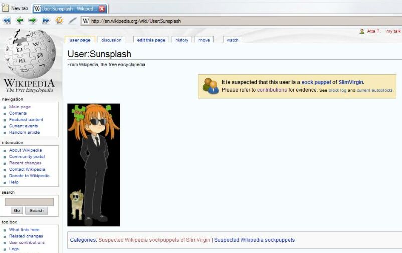Ultimately, a SlimVirgin sockpuppet account known as "Sweet Blue Water" was blocked from editing as a "Sockpuppet of administrator SlimVirgin, used abusively," but then subsequently unblocked by Jimbo, who said that it was an "inappropriate block." Jimbo also banned a Wikipedia editor who was investigating the topics where SlimVirgin had made some of her most questionable edits, including the articles on Pierre Salinger and the Lockerbie bombing, on the grounds that the investigator was "disrupting Wikipedia to make a point."