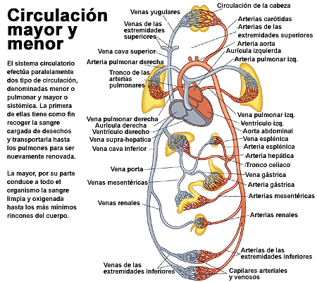 Així doncs , distingim una circulació menor que porta la sang des del ventícle dret cap al pulmons, on s'oxigena, i la retorna a l'aurícula esquerra; i una circulació major que porta sang oxigenada des del ventricle esquerre cap a tots els òrgans del cos i retorna aquesta sang, ja desoxigenada al cor