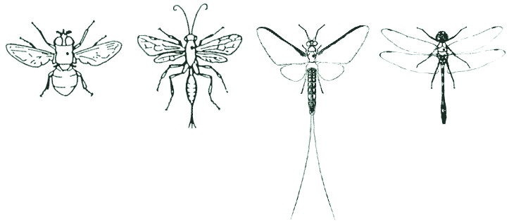 | 4. Adult DIPTERA, HYMENOPTERA, EPHEMEROPTERA, ODONATA & MECOPTERA should be pinned between the base of the fore-wings, slightly to the right of the mid-line of the body. |