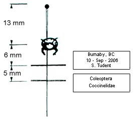 | Labeling of pinned insects is required to identify an insect's location and capture date, as well as the type of insect that was captured. This information can be provided on two labels. The first label, which sits closest to the insect (2nd height of your pinning block) should be comprised of 3 lines. The top line provides the PLACE of capture. The middle line provides the DATE of capture (written as day - month - year). The bottom line provides the name of the person that captured the insect. For example: Burnaby, BC 10-Sep-2006 S. Tudent The second label, which sits furthest from the insect (lowest height of your pinning block) should be comprised of two lines. The top line provides the order of the insect on the pin (which you determined using a taxonomic key). The bottom line provides the FAMILY of the insect on the pin (which you determined using a taxonomic key). For example: COLEOPTERA COCCINELIDAE |
