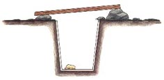 | 5. PITFALL TRAP: (Low-maintenance method for collecting ground roving insects) - A pitfall trap is simply a smooth-sided cup dug into the ground. The cup should be inserted far enough into the ground that it's rim is flush with the ground's surface. In this way, most insects that walk near the cup's edge will fall in and become trapped. It is often preferable to place a small amount of water into the cup to prevent flying insects from escaping. NOTE: In rainy weather, an uncovered pitfall trap will quickly fill with water. To prevent this, it is common to cover the opening with a make-shift 'tent' created from leaves and local debris. |