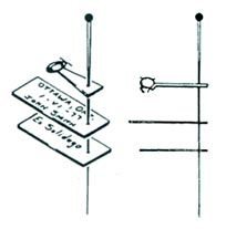 | Any adult insect (EXCEPT DIPTERA) that is too small to pin without causing damage should be pointed. Pointing involves inserting an insect pin (usually size 0-1) through the broad end of a small, stout, triangular piece of paper. The small end (tip) of the triangle is bent downward at a right angle (using forceps). A very small amount of glue is placed on this bent tip and this is then applied to the RIGHT side of the insect's thorax. A correctly pointed specimen has its body horizontal to the ground when the pin is upright. Label information and heights should be similar to those of pinned insects however, the pin should be inserted on the right side of the labels so that they are aligned directly beneath the point. |